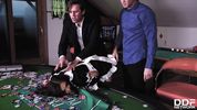 Два босса унижают и жёстко ебут во все дырки сексапильную девку-уборщицу игорного клуба